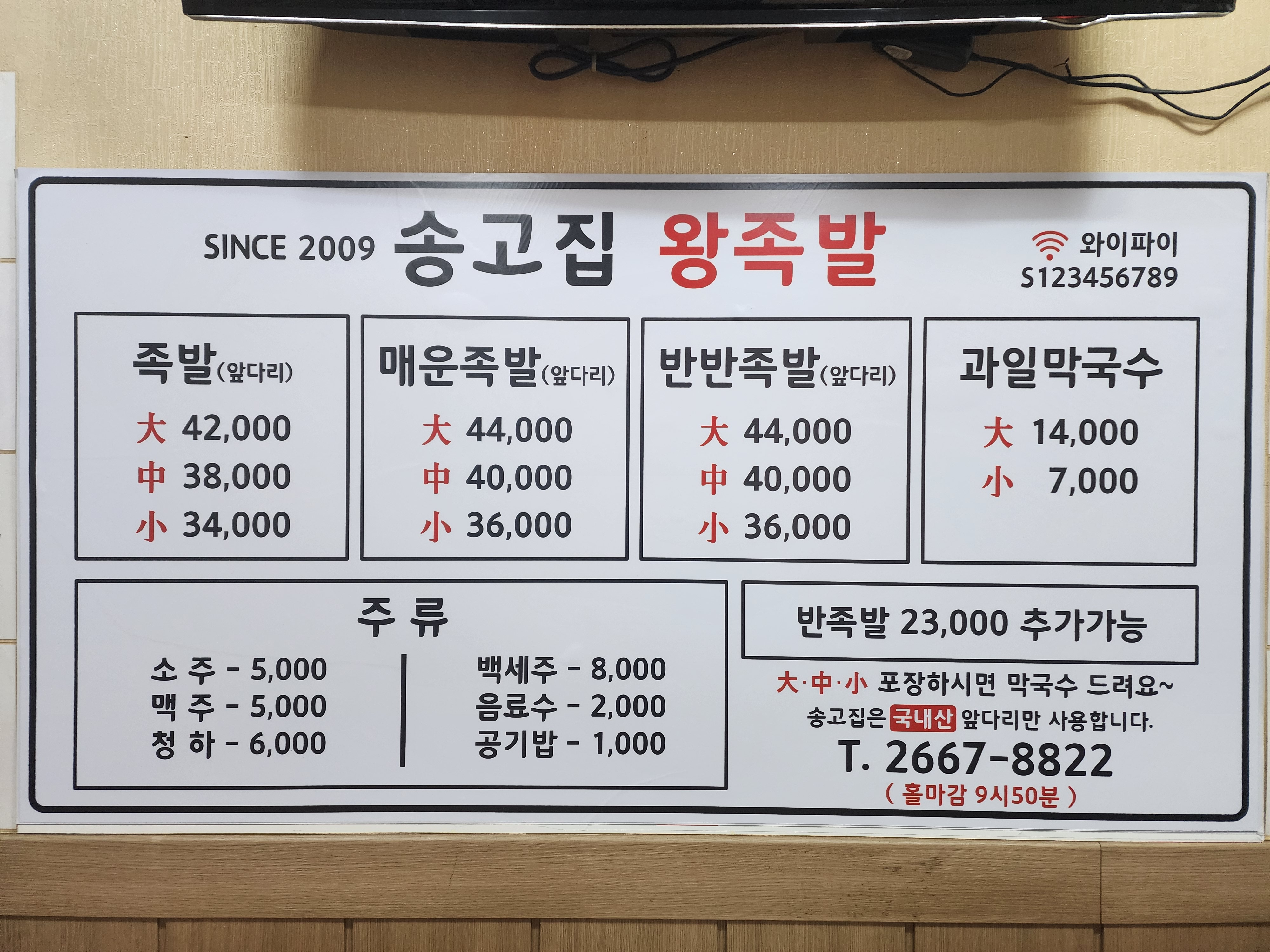 족발 특대(전족)_ 3~4인용 30,000 | 족발 대(후족)_ 3~4인용 25,000 | 족발 중(후족)_ 2~3인용 23,000 | 미니족 (3족) 15,000 | 미니족 (2족) 10,000 | 편육 10,000 | 막국수 5,000 | 매운 족발 주문시 추가요금 4,000 | 매운 미니족 주문시 추가요금 3,000