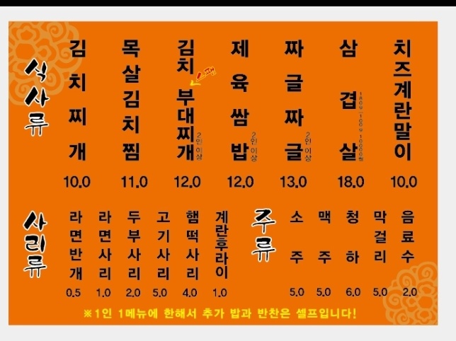 장독대 김치찌개 10,000 | 목살 김치찜 11,000 | 김치스팸부대찌개 12,000 | 제육쌈밥 12,000 | 짜글짜글 13,000 | 김치生삼겹살 18,000 | 치즈계란말이 10,000