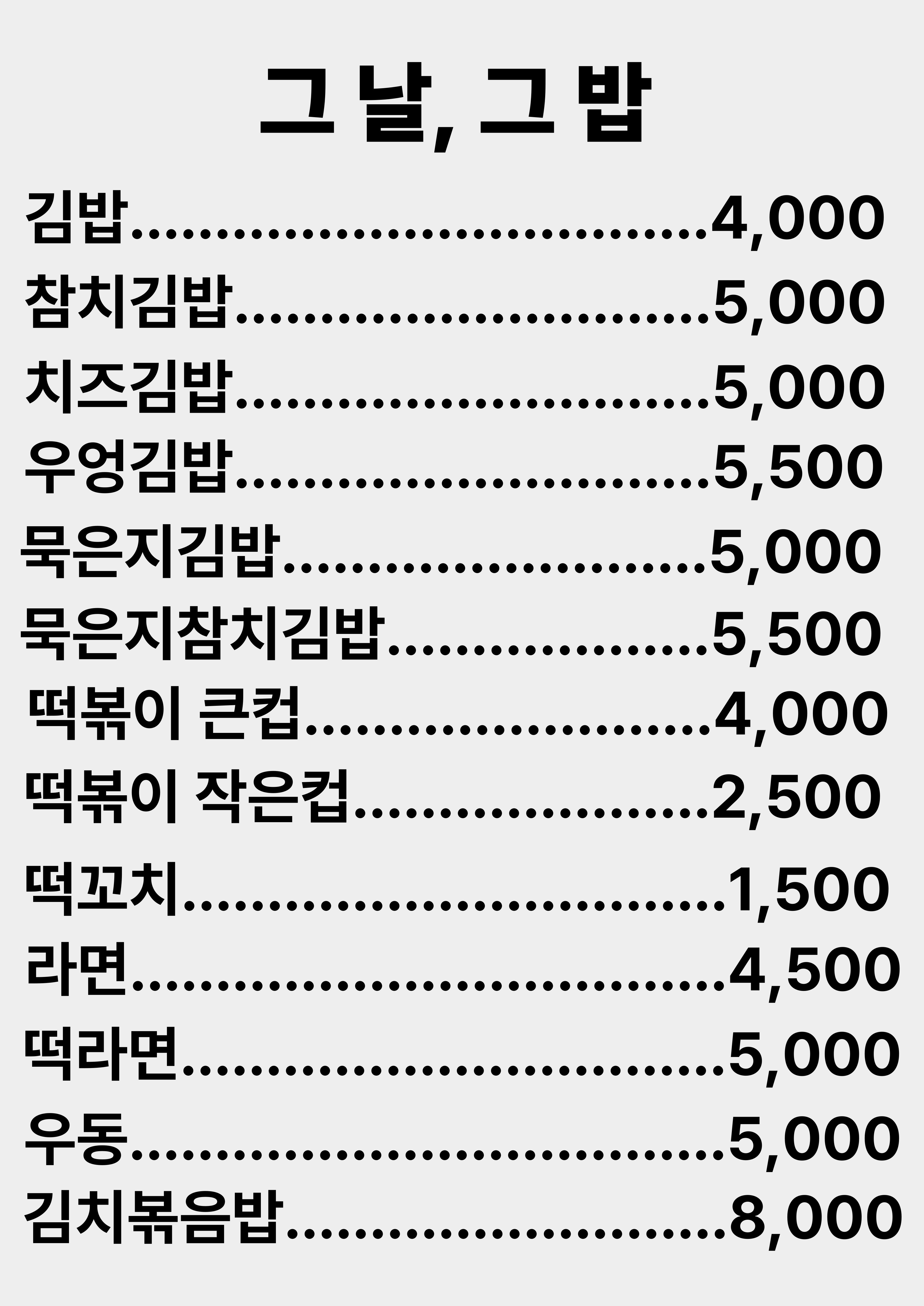 🥢 엄마김밥 3,800 | 🍙 반줄김밥 2,000 | 🧀 더블치즈김밥 4,500 | 🐟 참치김밥 4,500 | 🌶️ 땡초 참치김밥 5,200 | 🥢 왕 돈까스김밥 5,600 | 🌶️(왕)매운 돈까스 김밥 5,800 | 떡볶이 범벅 2,000 | 🍢 꼬치어묵 2,000 | 🍜 어묵면 한 그릇 3,500 | ❄️냉모밀 6,000 | 💧 물떡 2,000 | 🔥 끼니떡볶이 4,000 | 🧀 치즈떡볶이 5,000 | 🥟 야끼만두 2,000 | 🥟 야끼만두 범벅 4,000 | 🧆 팝만두 3,000