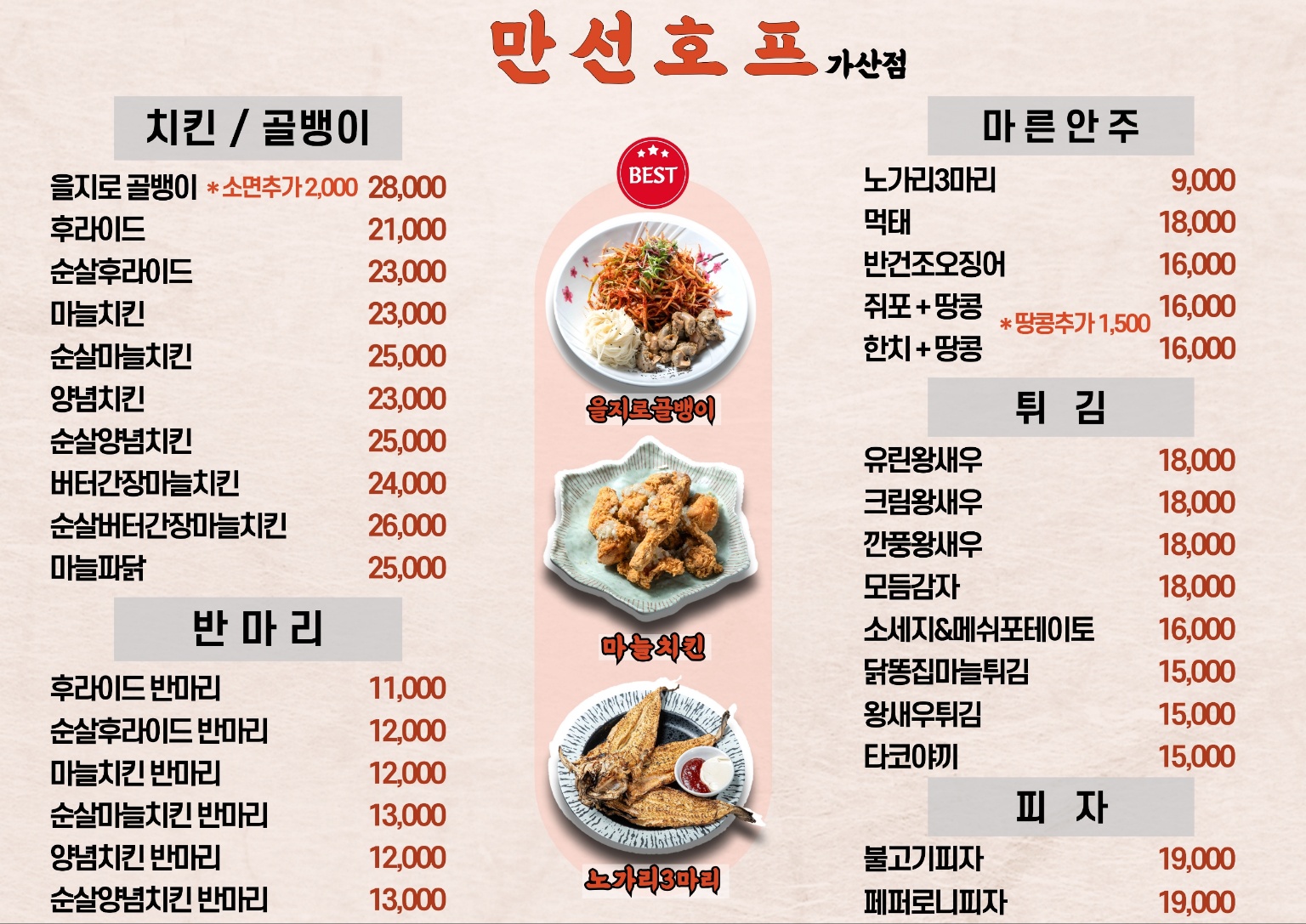 을지로 골뱅이 28,000 | 후라이드 21,000 | 순살후라이드 23,000 | 마늘치킨 23,000 | 순살마늘치킨 25,000 | 양념치킨 23,000 | 순살양념치킨 25,000 | 간장마늘치킨 24,000 | 순살간장마늘치킨 26,000 | 마늘파닭 25,000 | 마늘파닭(순살) 27,000 | 노가리 3마리 10,000 | 먹태 18,000 | 반건조오징어 16,000 | 쥐포 땅콩 16,000 | 한치 땅콩(2마리) 18,000 | 유린왕새우 18,000 | 크림왕새우 18,000 | 모듬감자 18,000 | 소세지&메쉬포테이토 16,000 | 닭똥집마늘튀김 15,000 | 왕새우튀김 15,000 | 타코야끼 15,000 | 불고기피자 19,000 | 페퍼로니피자 19,000 | 낙지소면 20,000 | 해물떡볶이 20,000 | 국물닭발 20,000 | 두부김치 20,000 | 철판닭똥집볶음 15,000 | 무뼈닭발볶음 15,000 | 베이컨숙주볶음 15,000 | 해물짬뽕탕 20,000 | 나가사키짬뽕 20,000 | 오뎅탕 20,000 | 모듬조개탕 17,000 | 김치찌개 18,000 | 스팸후라이 15,000 | 케이준샐러드 15,000 | 해장라면 8,000 | 명란계란말이 12,000 | 주먹밥 3,000 | 아이스망고 15,000 | 황도 12,000 | 파인샤베트 10,000 | 테라생맥주 500cc 5,000 | 소주 5,000 | 병맥주 5,000 | 청하 6,000 | 일품진로 SET 30,000 | 일품진로(단품) 25,000 | 토닉워터 3,000 | 레몬추가 3,000 | 음료수 3,000 | 하나야구 준마이 900ml 35,000 | 스바루 나마죠조 900ml 35,000 | 도쿠리 (온,냉) 9,000 | 샤인머스켓 하이볼 9,000 | 피치 하이볼 9,000 | 레몬하이볼 9,000 | 스트로베리하이볼 9,000 | 산토리 하이볼 9,000 | 하이볼 8,000