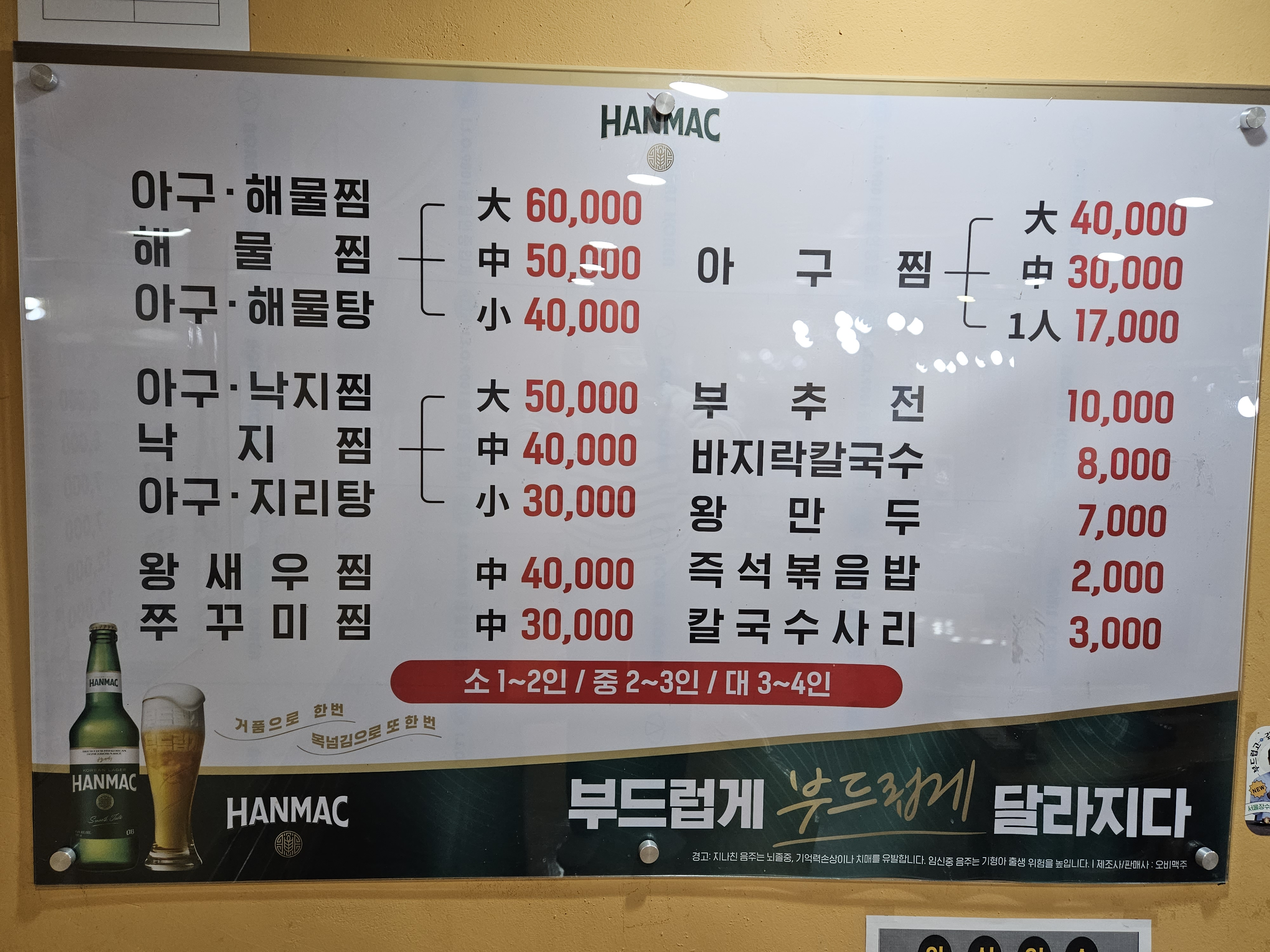 아구찜(소) 39,000 | 아구찜(중) 50,000 | 아구찜(대) 60,000 | 아구찜(특대) 78,000 | 해물전골(소) 42,000 | 해물전골(중) 50,000 | 해물전골(대) 60,000