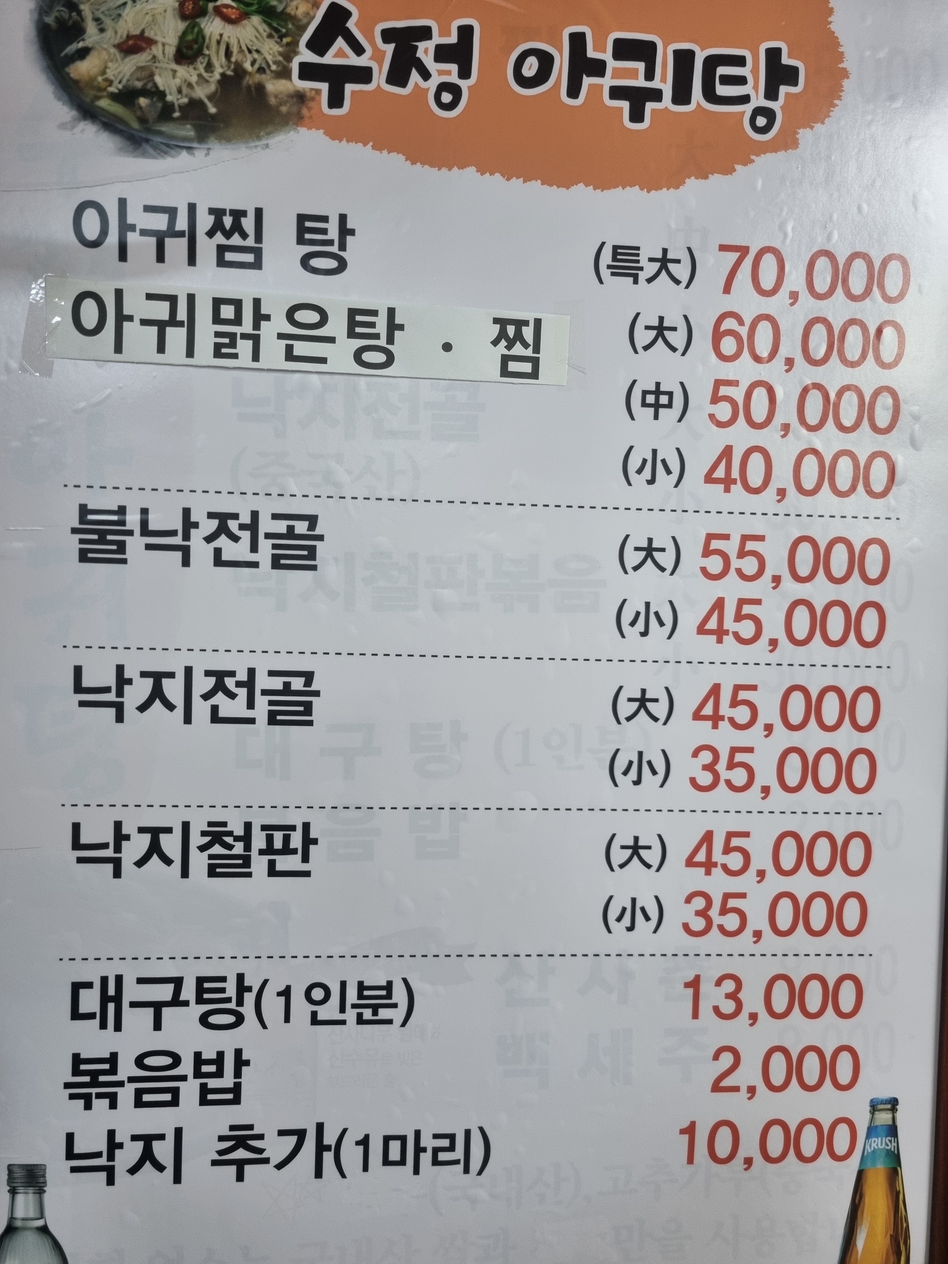 아구찜小 40,000 | 불낙전골(소) 45,000