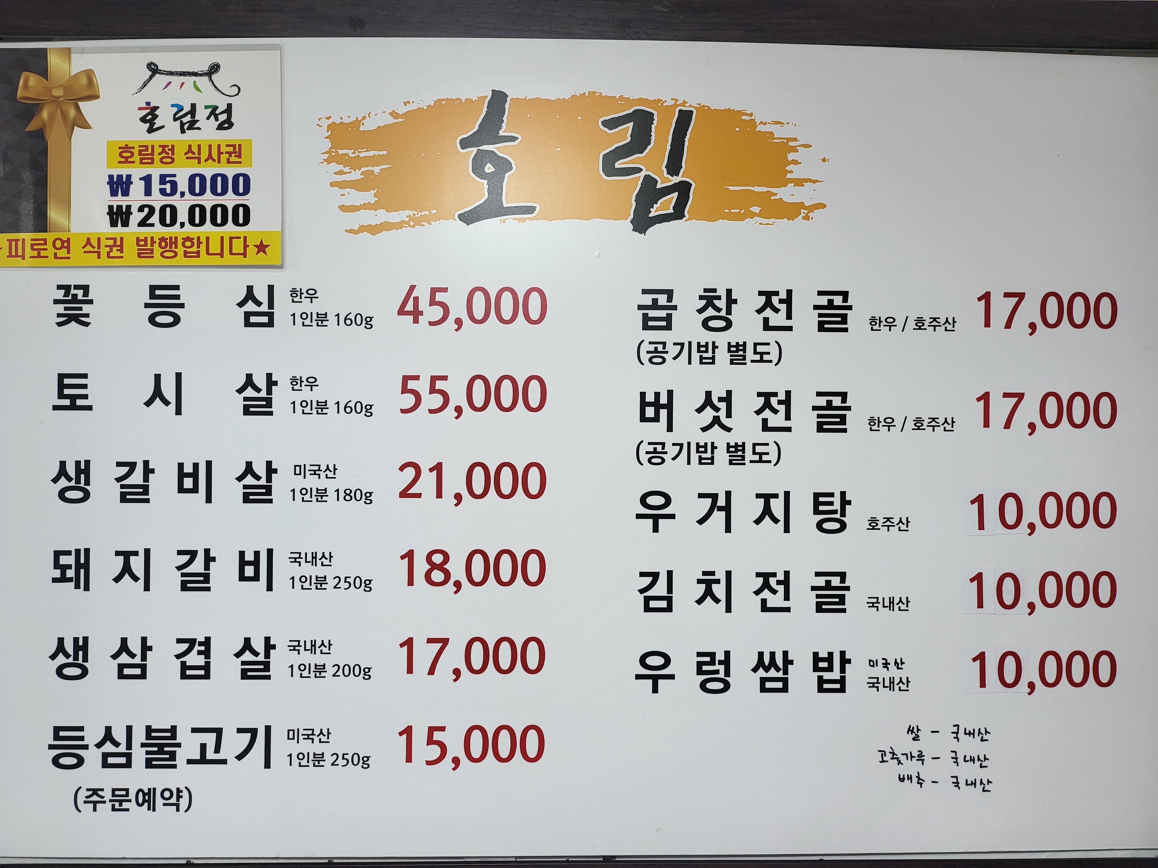 쌈밥 10,000 | 불고기전골 10,000 | 김치찌개 9,000 | 비빔밥 8,000 | 생삼겹살200g 15,000